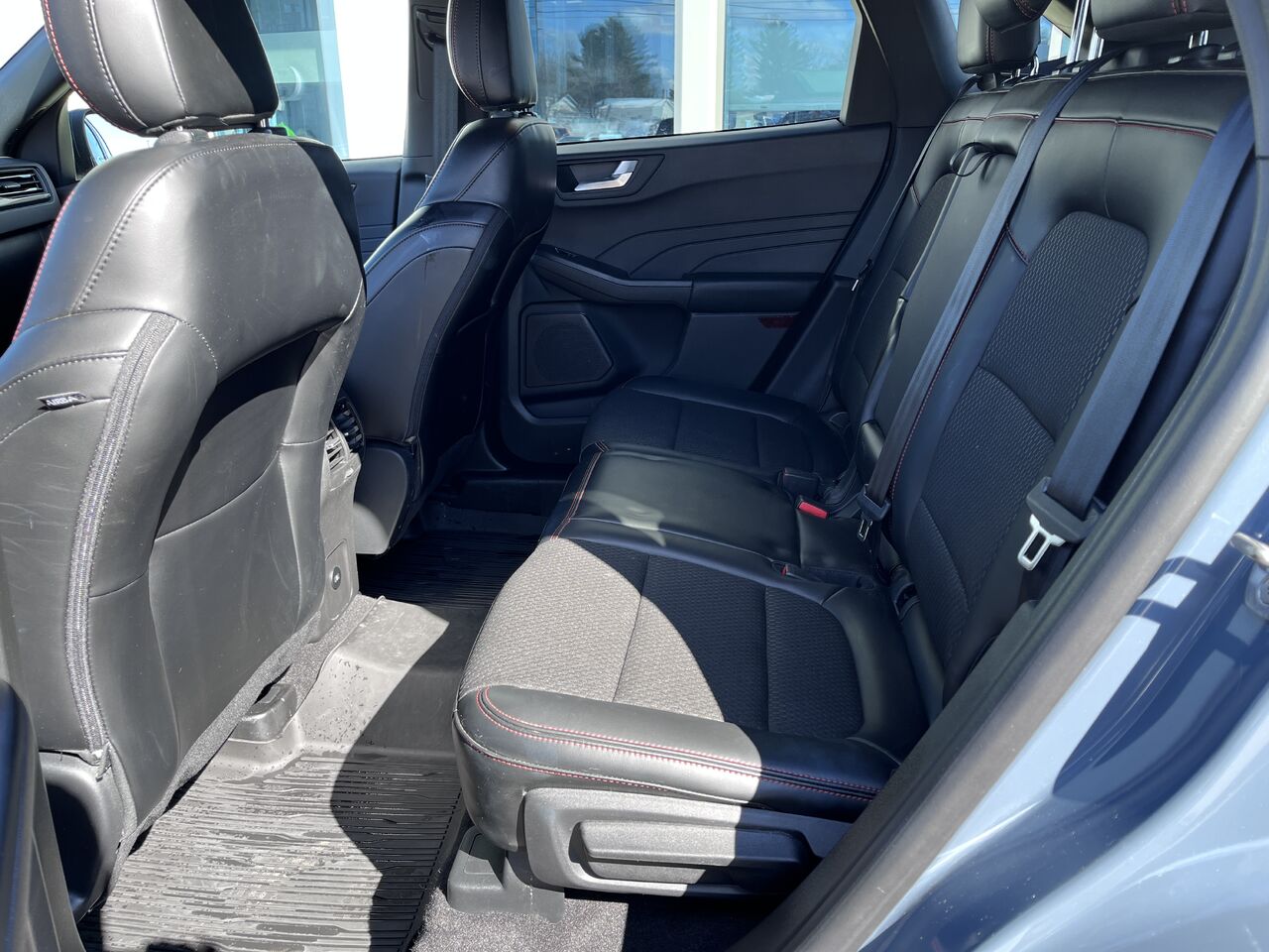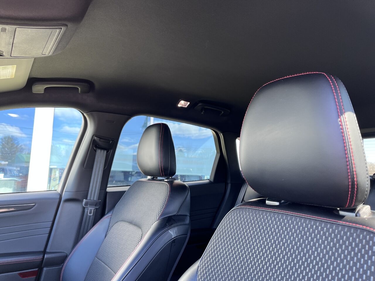 Sièges baquets sport contours partiellement en vinyle et en tissu -comprend : piqûres rouges